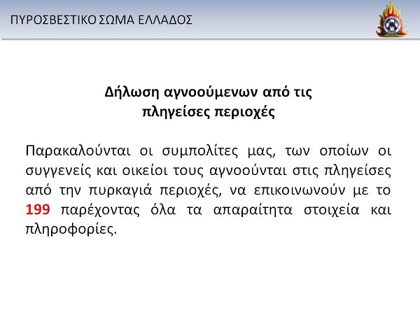 Συγκεκριμένα, η Πυροσβεστική παρακαλεί τους πολίτες των οποίων οι συγγενείς και οικείοι τους αγνοούνται στις πληγείσες από την πυρκαγιά περιοχές, να καλούν στο 199 παρέχοντας όλα τα απαραίτητα στοιχεία και πληροφορίες.